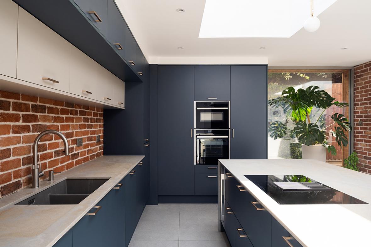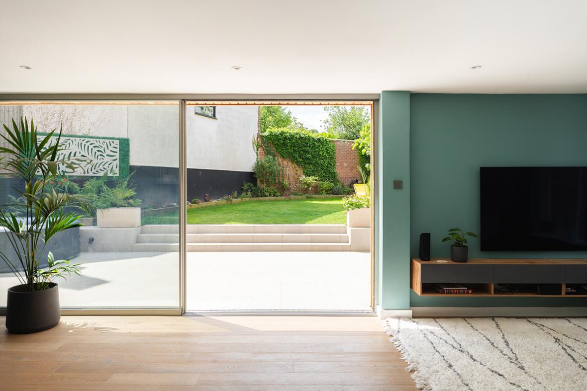 When the property was extended, rather than replicating its original character, a new design was conceived for both the extension and the main building. Vertical larch cladding was used to create a cohesive look between the extension and the original structure. Large sliding pocket doors open the house up to the garden. A new generous patio, with wide steps that overcome the challenging topography, makes garden access easy. The external pocket doors fully disappear into the walls, creating unobstructed openings that seamlessly integrate the indoors with the outdoors, completely transforming what were once rooms with small windows that felt disconnected from the garden.