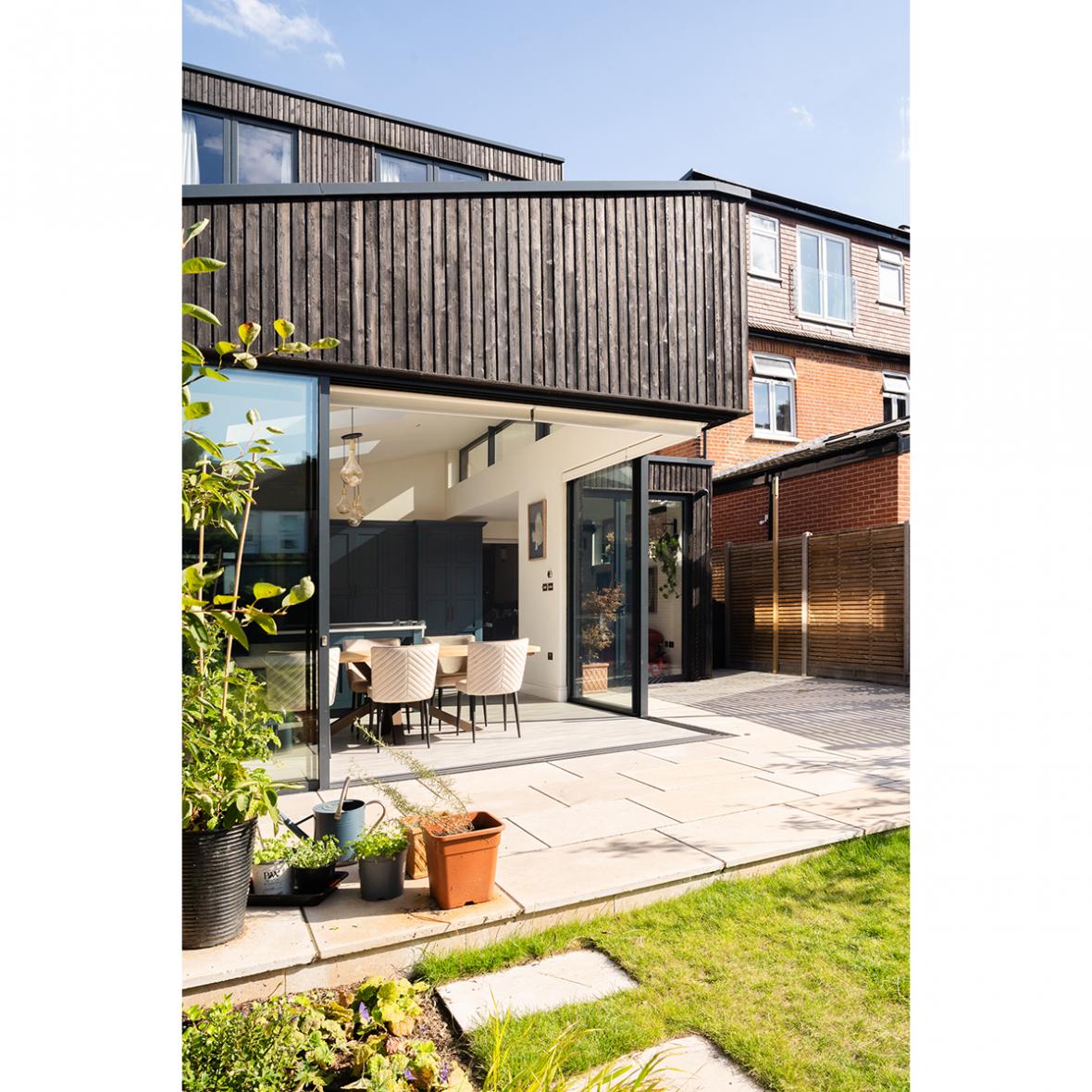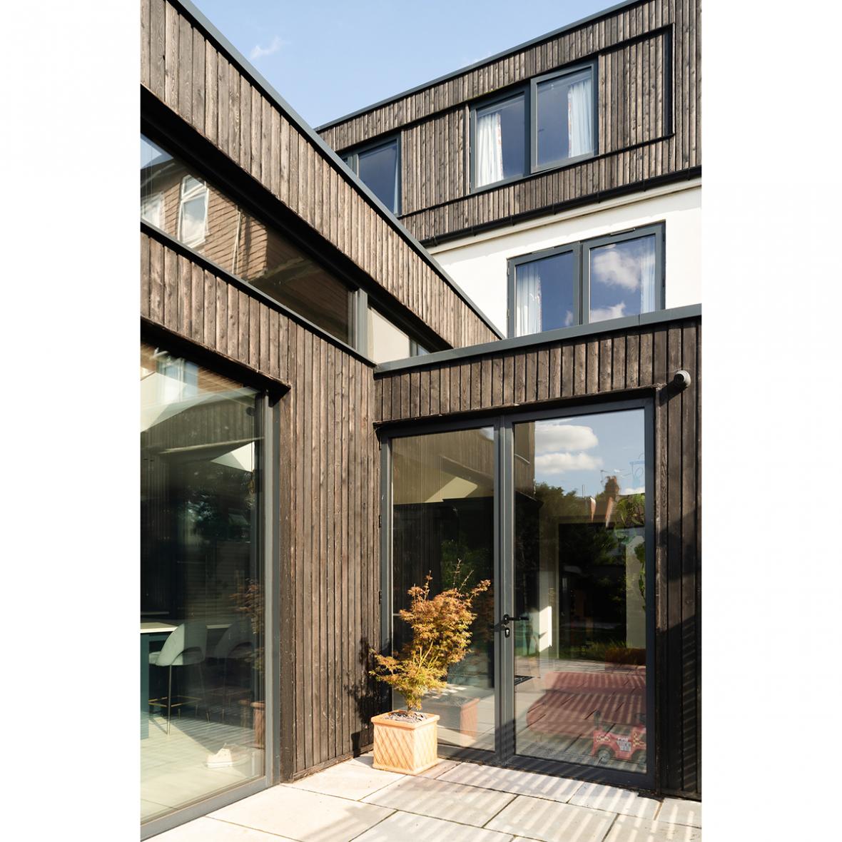 The ground floor and loft extensions are finished in charred timber cladding, providing a striking contrast to the white render of the existing building. The finish I slow maintenance and feels tactile and warm, with vertical slim planks adding texture to the facade.