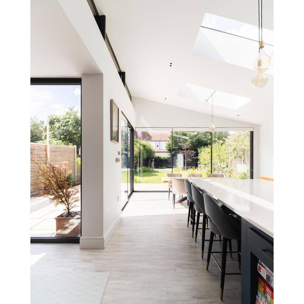 Inside the extension, a vaulted ceiling with skylights and clerestory windows brings natural light into the deep space. The upper floors were fully refurbished, and the loft has been extended through a hip-to-gable alteration and the addition of a rear dormer.