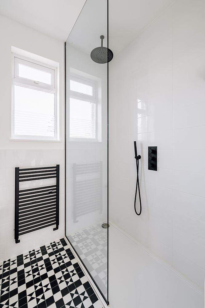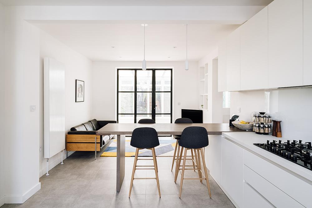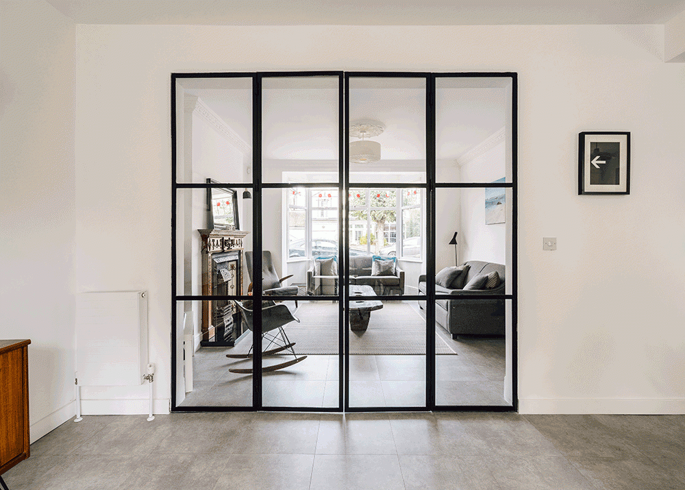 We joined 2 houses together into a single dwelling and remodelled it internally to create this beautiful 4-bedroom house with a free flow ground floor layout divided by black steel frame doors.