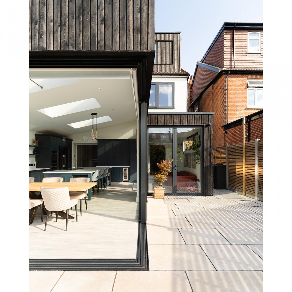 The ground floor and loft extensions are finished in charred timber cladding, providing a striking contrast to the white render of the existing building. The finish I slow maintenance and feels tactile and warm, with vertical slim planks adding texture to the facade.