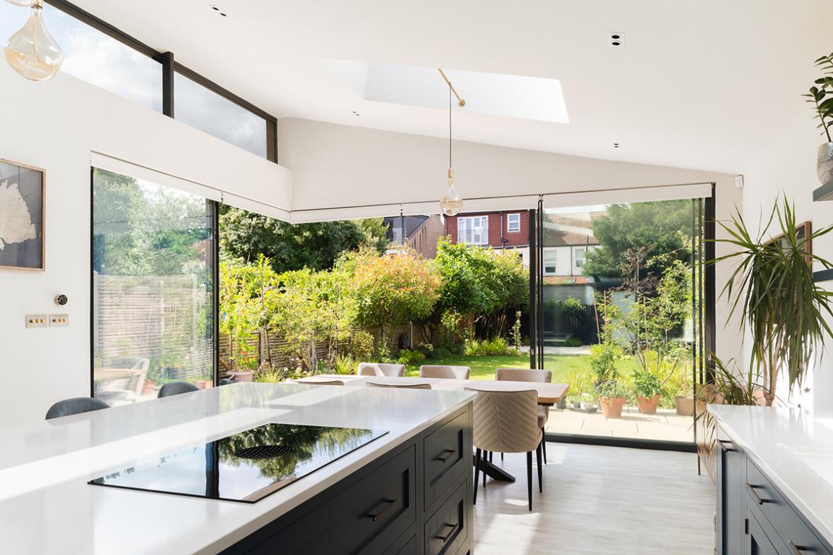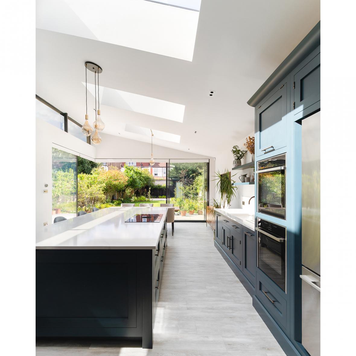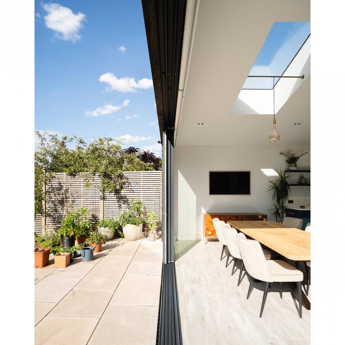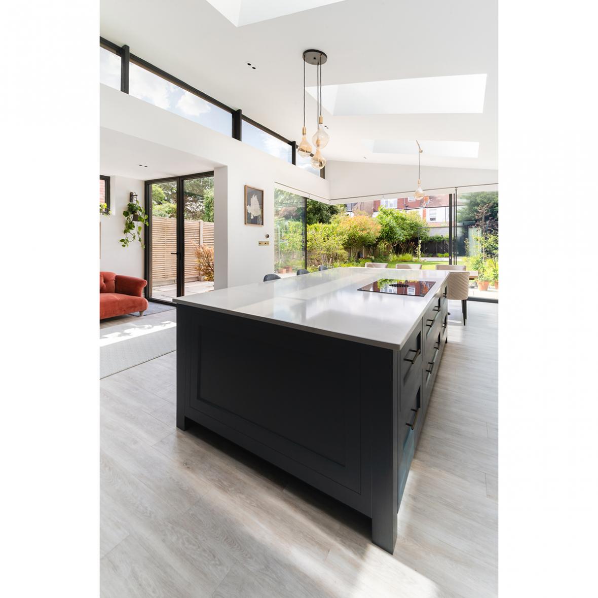 Inside the extension, a vaulted ceiling with skylights and clerestory windows brings natural light into the deep space. The upper floors were fully refurbished, and the loft has been extended through a hip-to-gable alteration and the addition of a rear dormer.