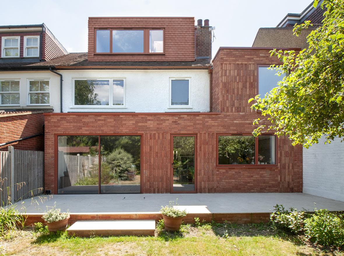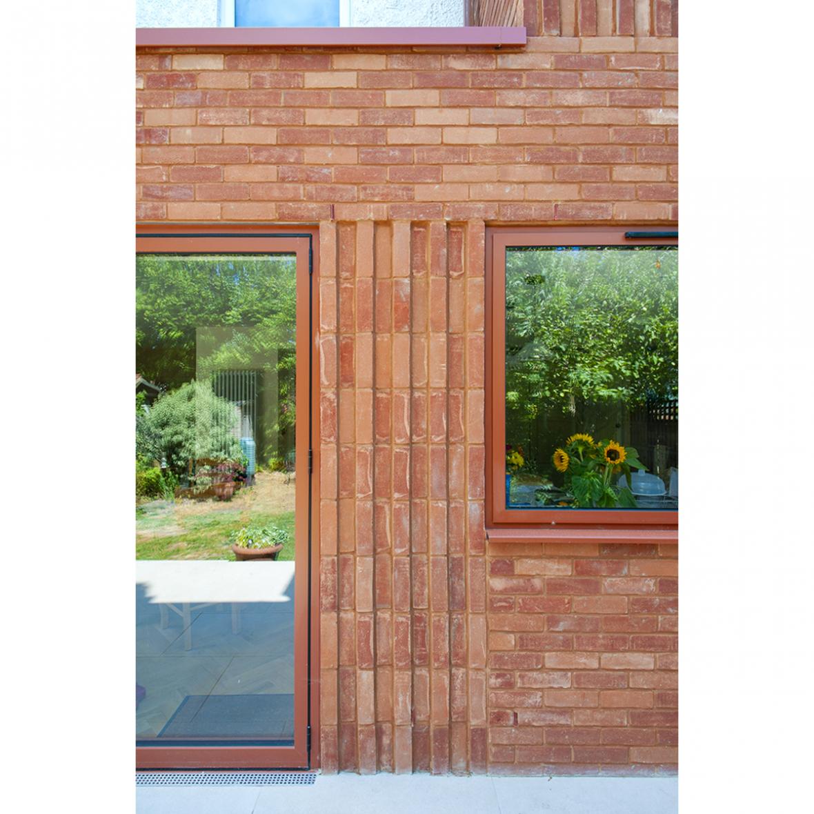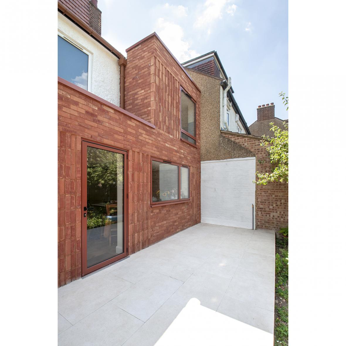 The design of the exterior adopts a monochromatic approach with a rusty red colour theme, inspired by the prevailing finishes of the host and adjacent properties. It implements a tone-in-tone composition of brick, including colour-matched mortar, hung tiles, metal door and window frames, and rainwater goods. A subtle variation in the brick coursing, which is a result of combining a stretcher bond with an in-and-out vertical stack bond, adds a tectonic texture to the facade.